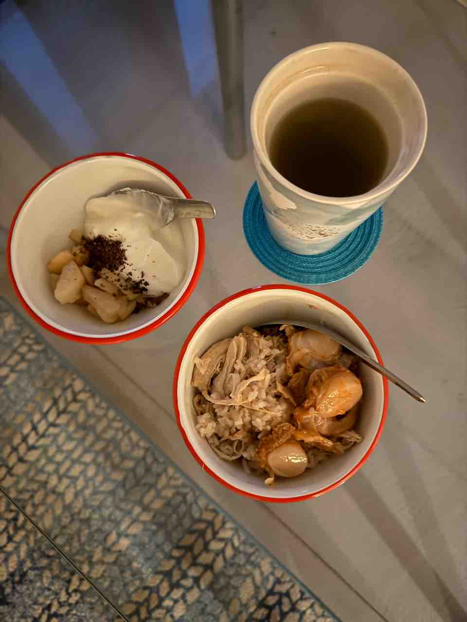 りんごを煮たやつにヨーグルト、カカオニブ。緑茶。