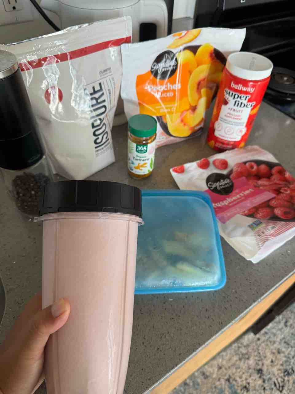 お水、冷凍ピーチ、冷凍ラズベリー、食物繊維のパウダー、生姜皮ごと、ターメリック、ブラックペッパー。