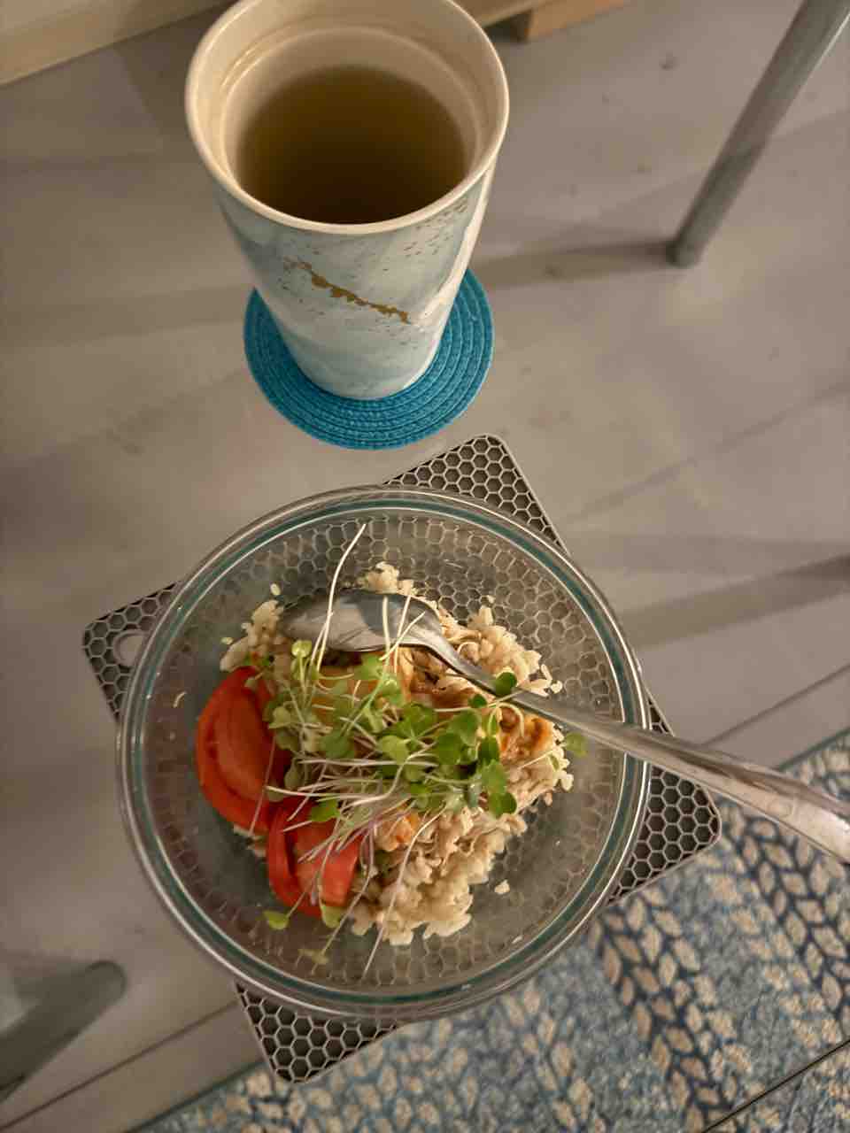 雑穀米、トマト、ホタテのポケ、マイクログリーン。
