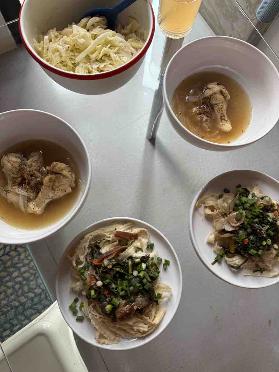 夜ご飯は、キャベツとりんごと梨のコールスローと、チキンのスープ。