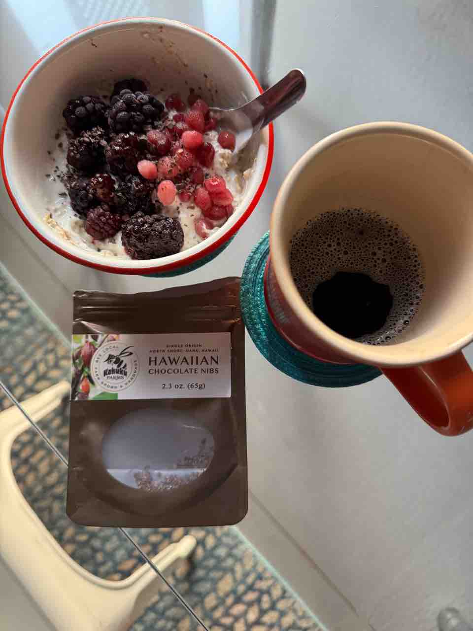 オートミールにはブラックベリーと柘榴、カカオニブ。
