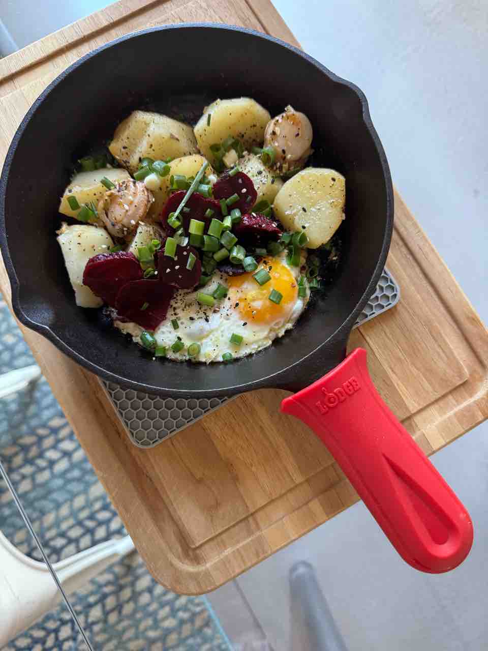 ランチはジャガイモとホタテ、ビーツと目玉焼き〜!