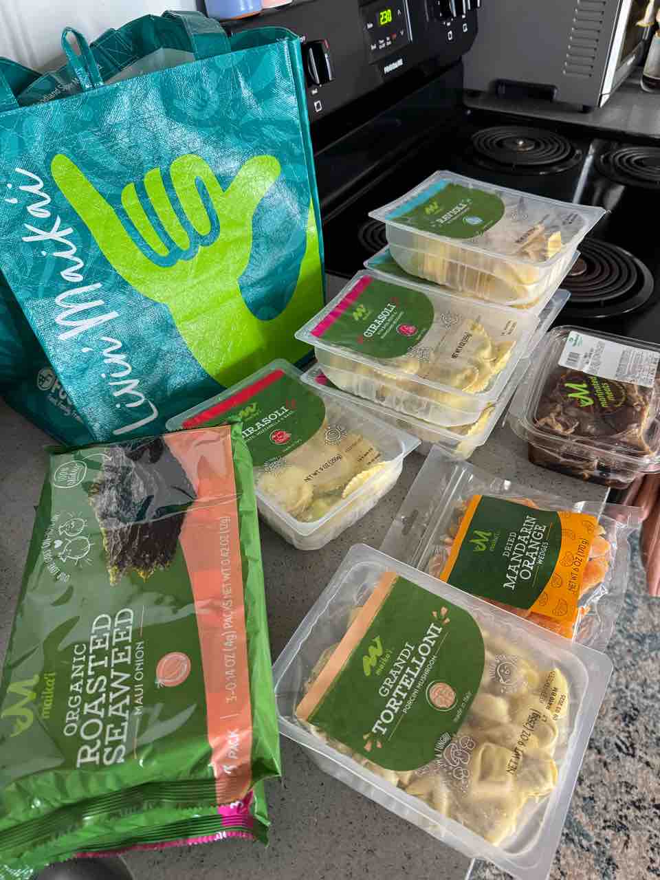 冷凍ラビオリ7個と、マリネ牛肉、韓国海苔、みかんのドライフルーツ〜!