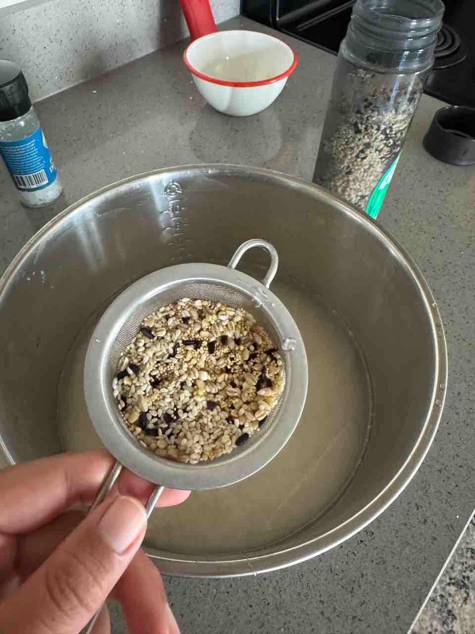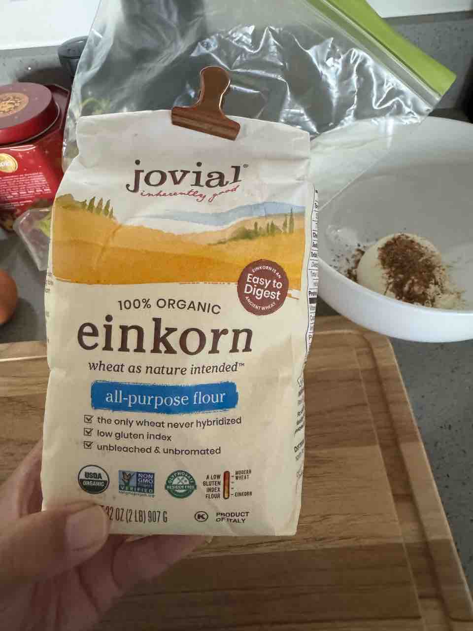アインコーンっていう古代小麦に、出汁パックの中身と、卵入れて混ぜて適当に生地作ったやつ。