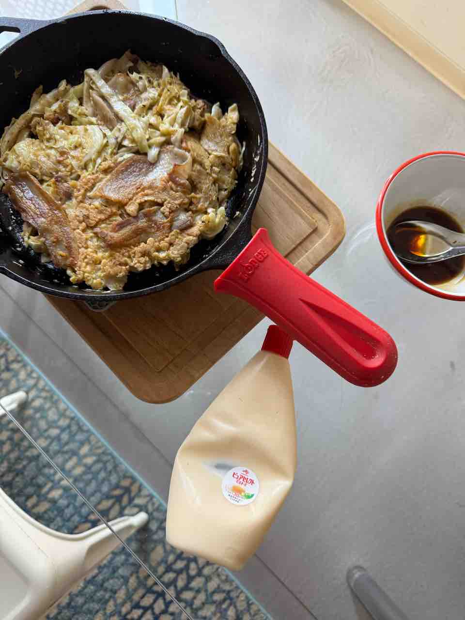 ソースがないので、適当にお醤油と生ハチミツ混ぜて、ちょっとマヨネーズかけたら、お好み焼きっぽい味になりました。