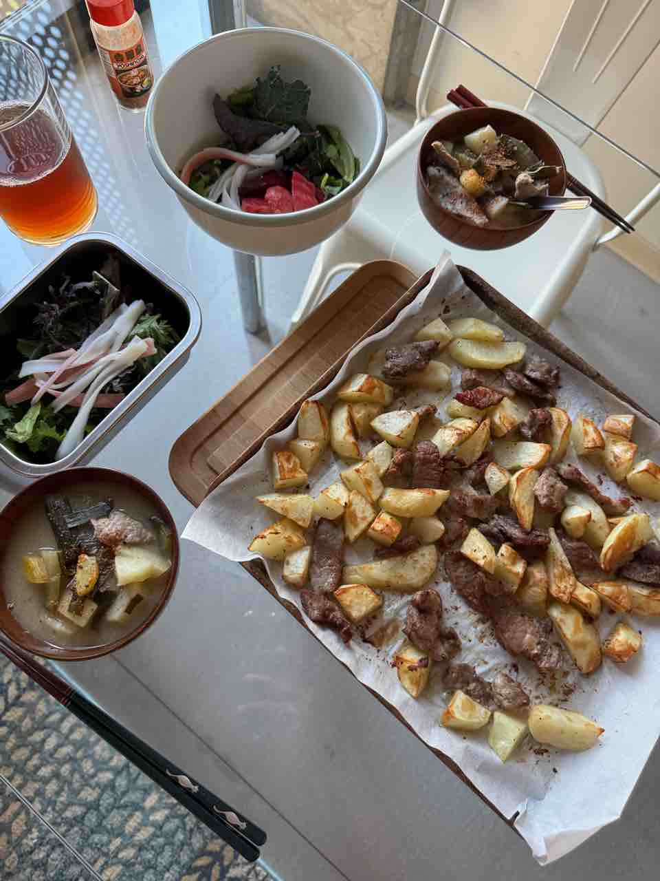 野菜たっぷり冬瓜入り豚汁と、じゃがいもとポテトのエアフライ。