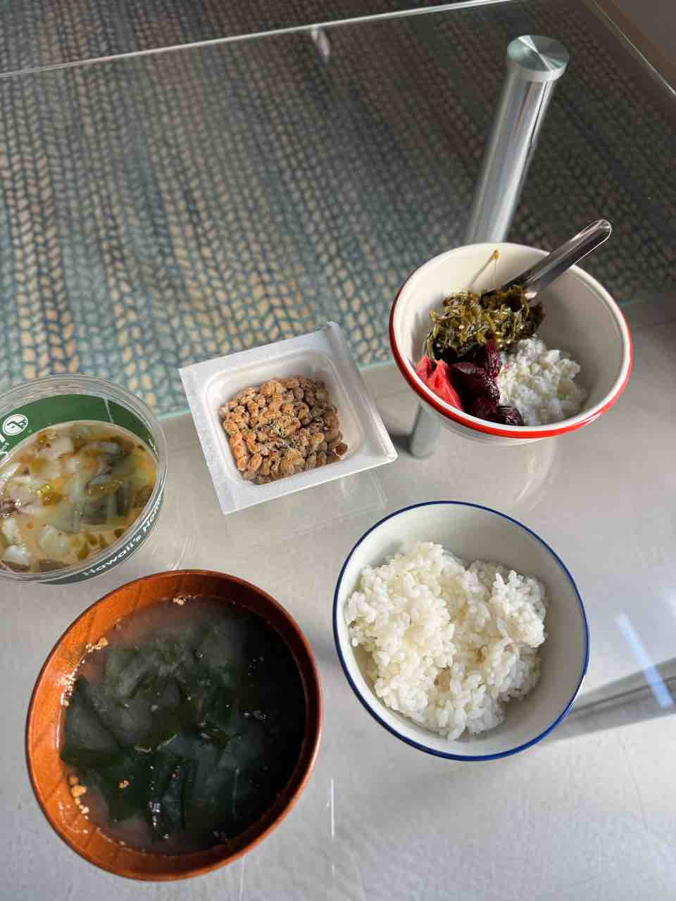 ビーツと低脂肪のカッテージチーズ、納豆、イカワサ、わかめの味噌汁、白米100g。