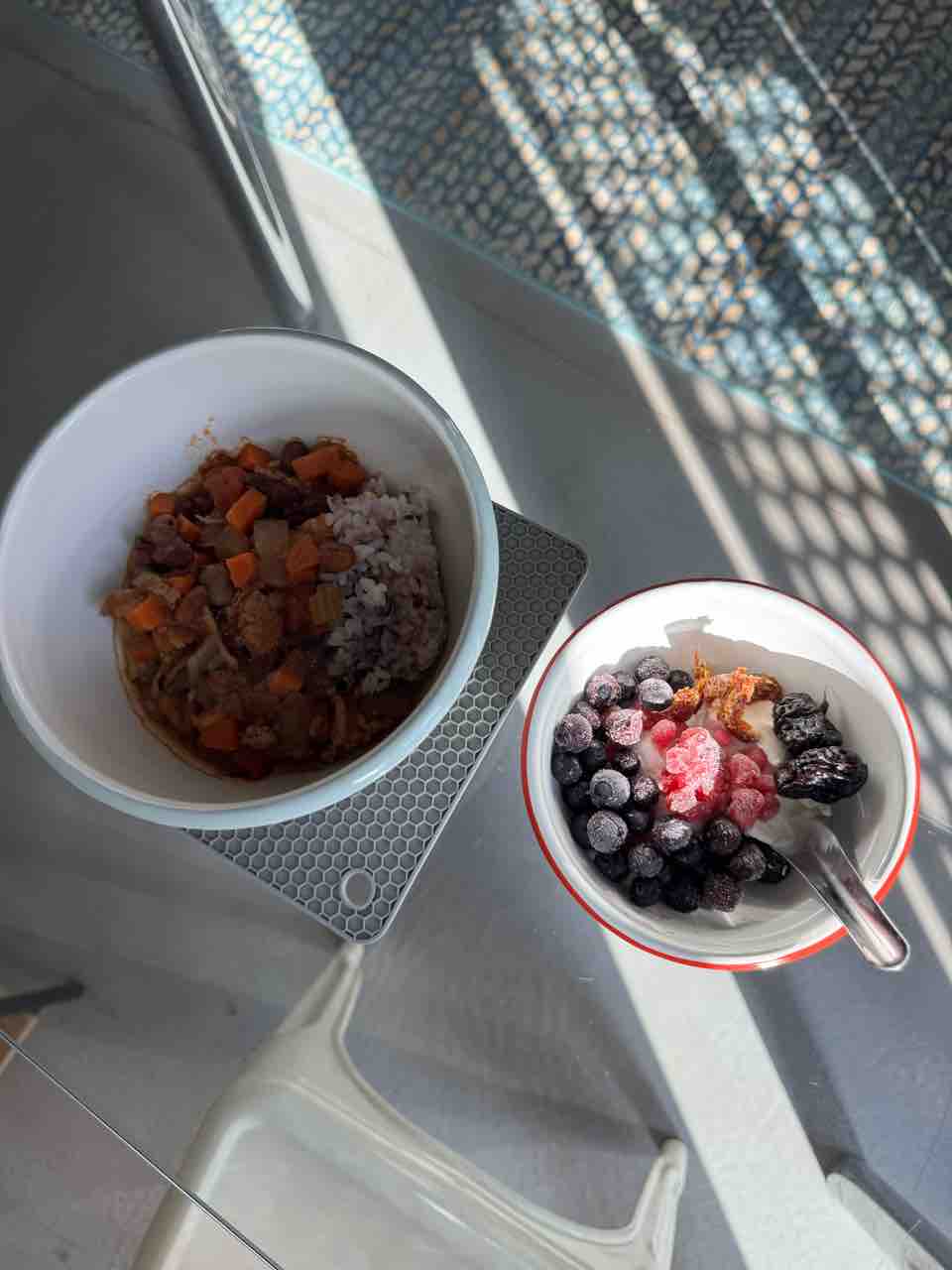 朝はターキーチリと雑穀米に、ギリシャヨーグルト。ブルーベリー、プルーン、ザクロ、デーツのせ。