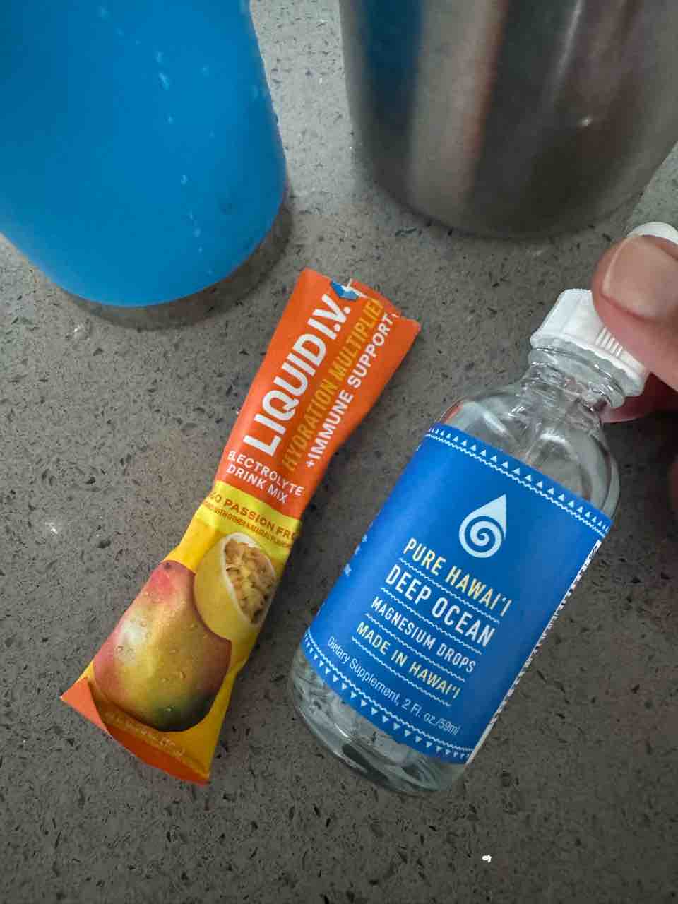 夫のはLIQUID IVを入れて、私のはハワイ島の海洋深層水のマグネシウムドロップ!
