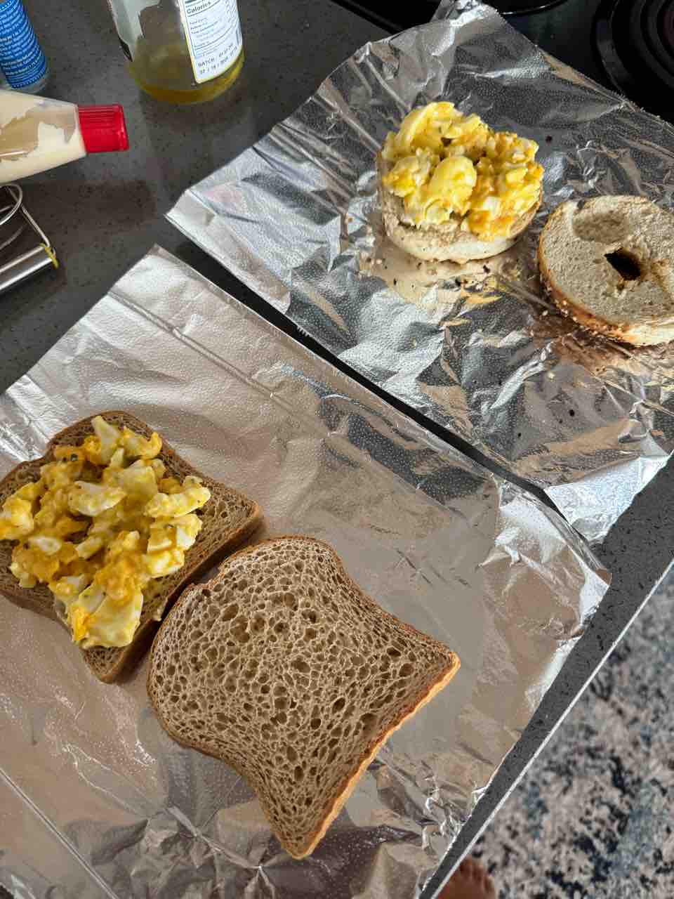 夫のパンはベーグルで私のは高タンパクグルテンフリーパンです。
