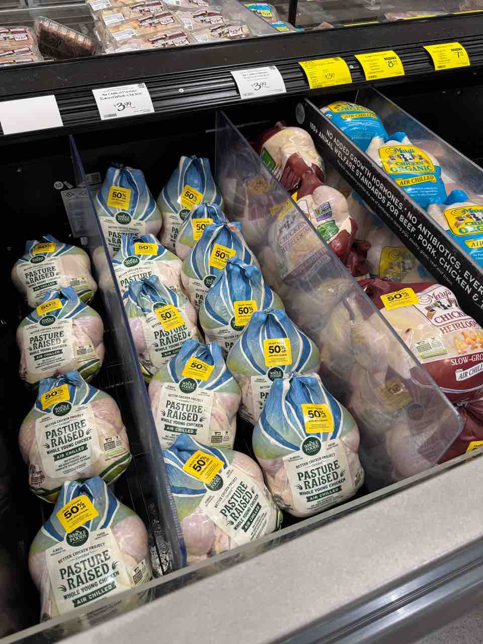 帰りにホールフーズに寄ったら、ありとあらゆるチキンが50%オフになっていて、お気に入りのHEIRLOOM丸鶏をゲット✌️