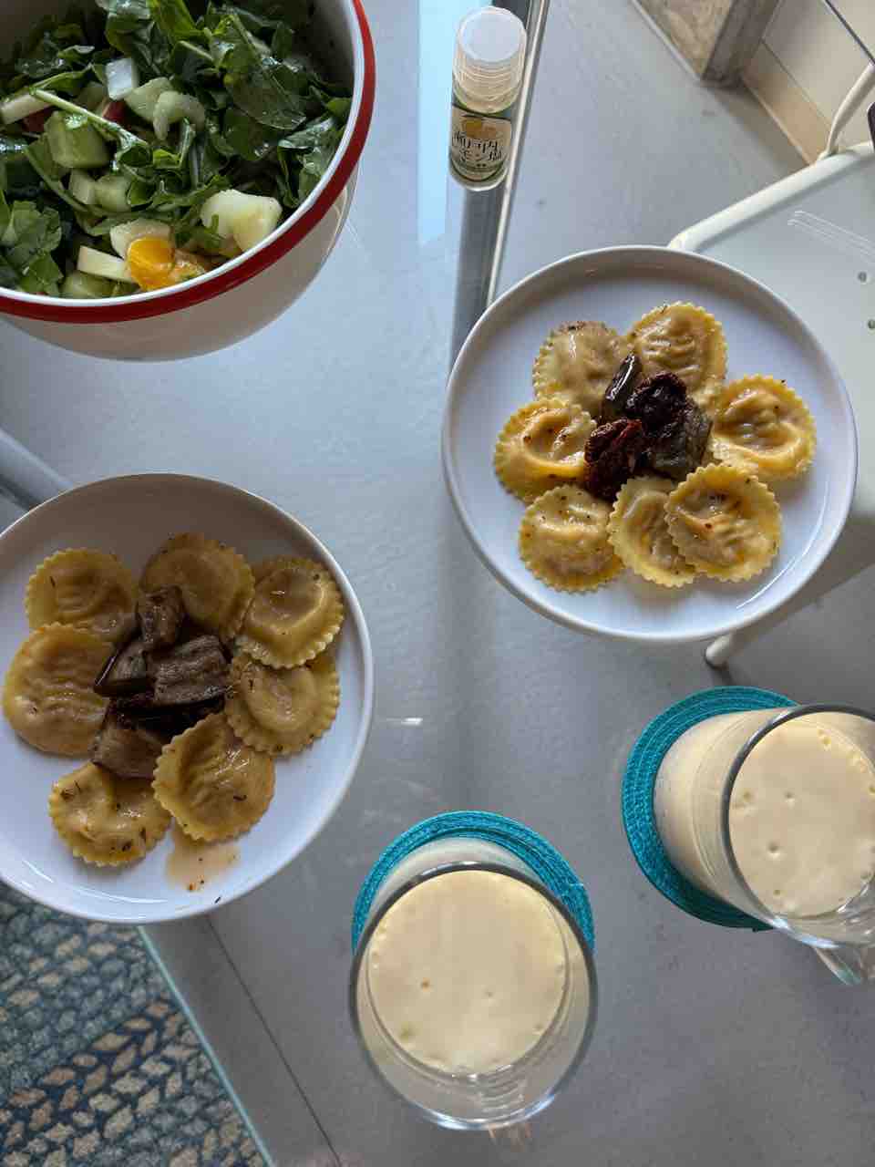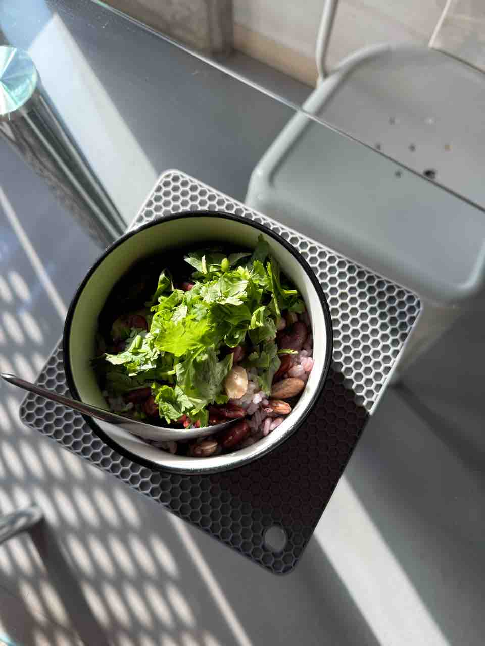 朝はレフトオーバーのジャイロ肉と雑穀米、豆、パクチー。