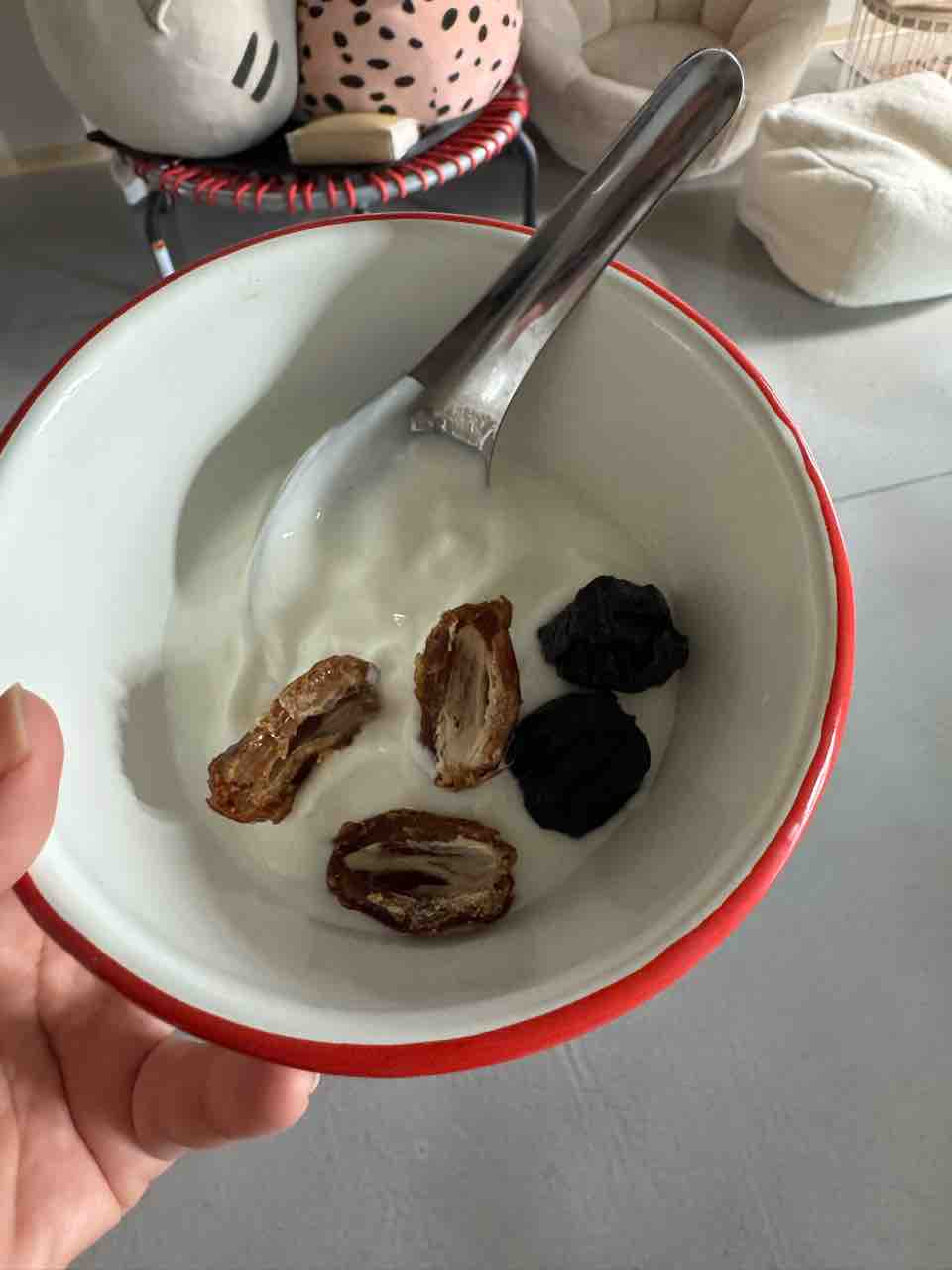 おやつにギリシャヨーグルト。プルーンとデーツのせ。