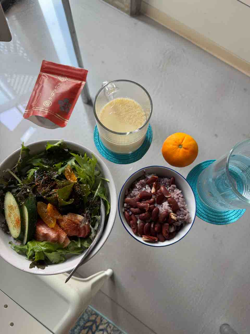 昨日の朝は雑穀米とワカメスープ、納豆、ギリシャヨーグルト、みかん。