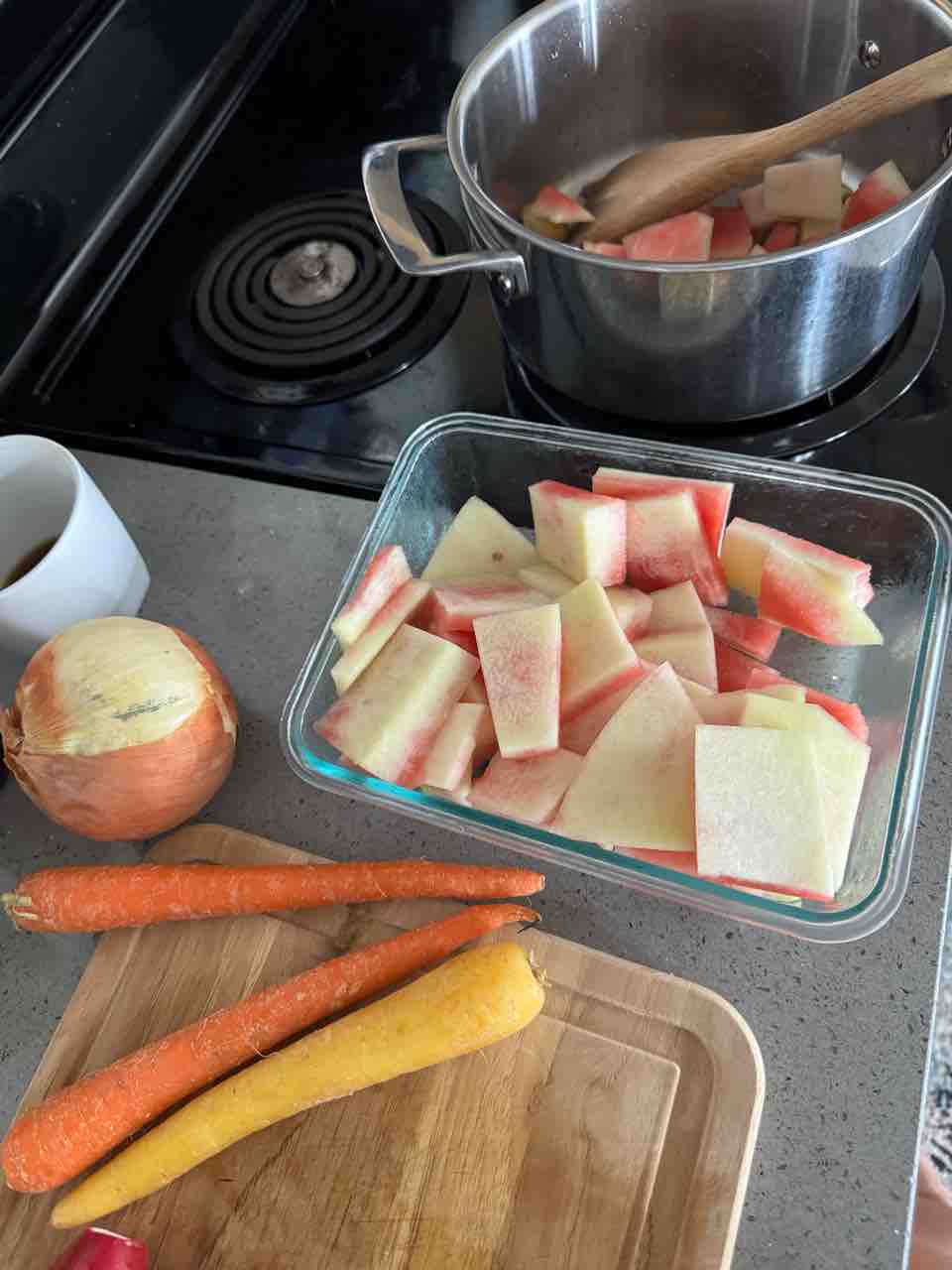 夜はスイカの白いところをどうにかしたくてポタージュに。