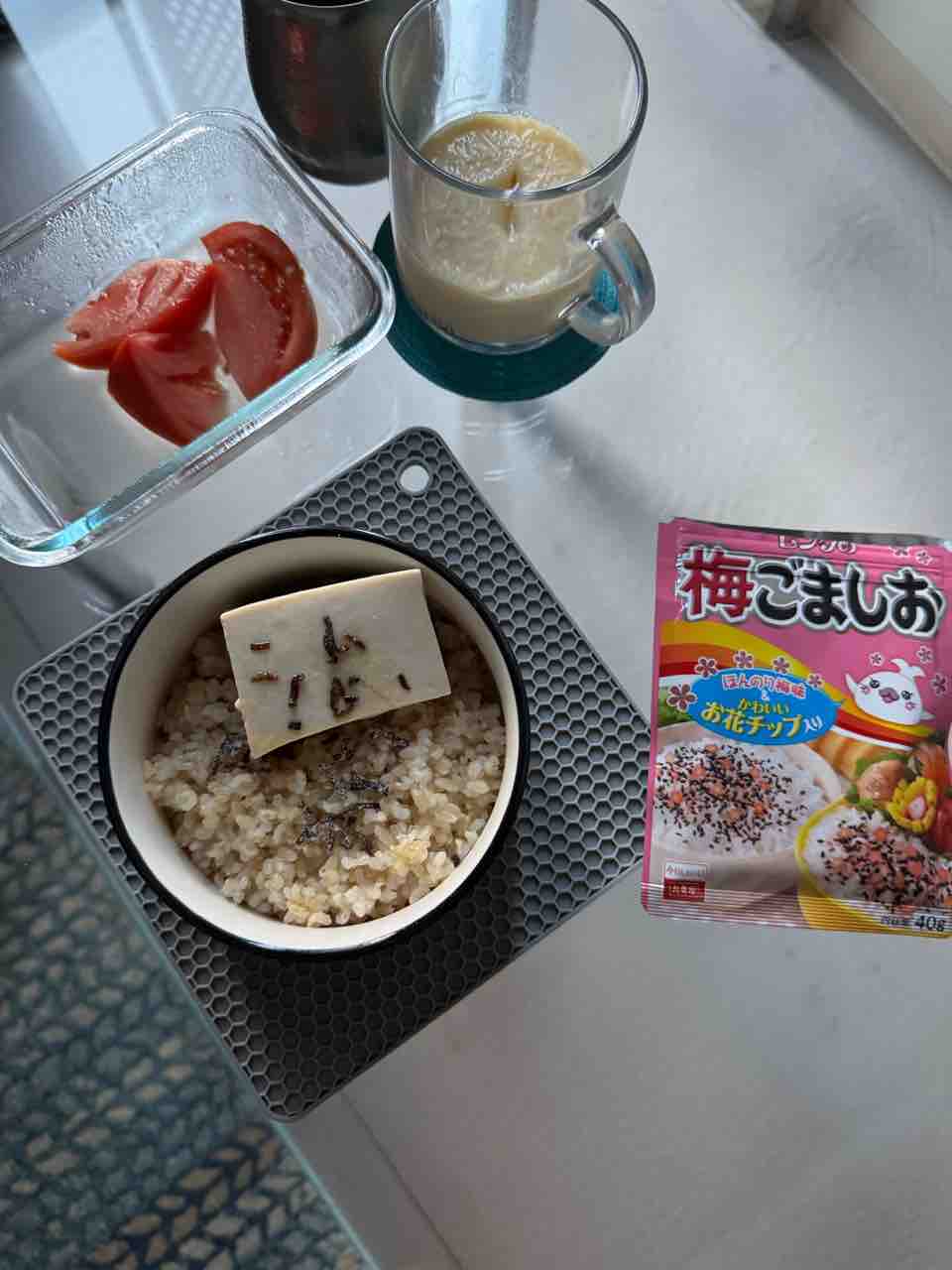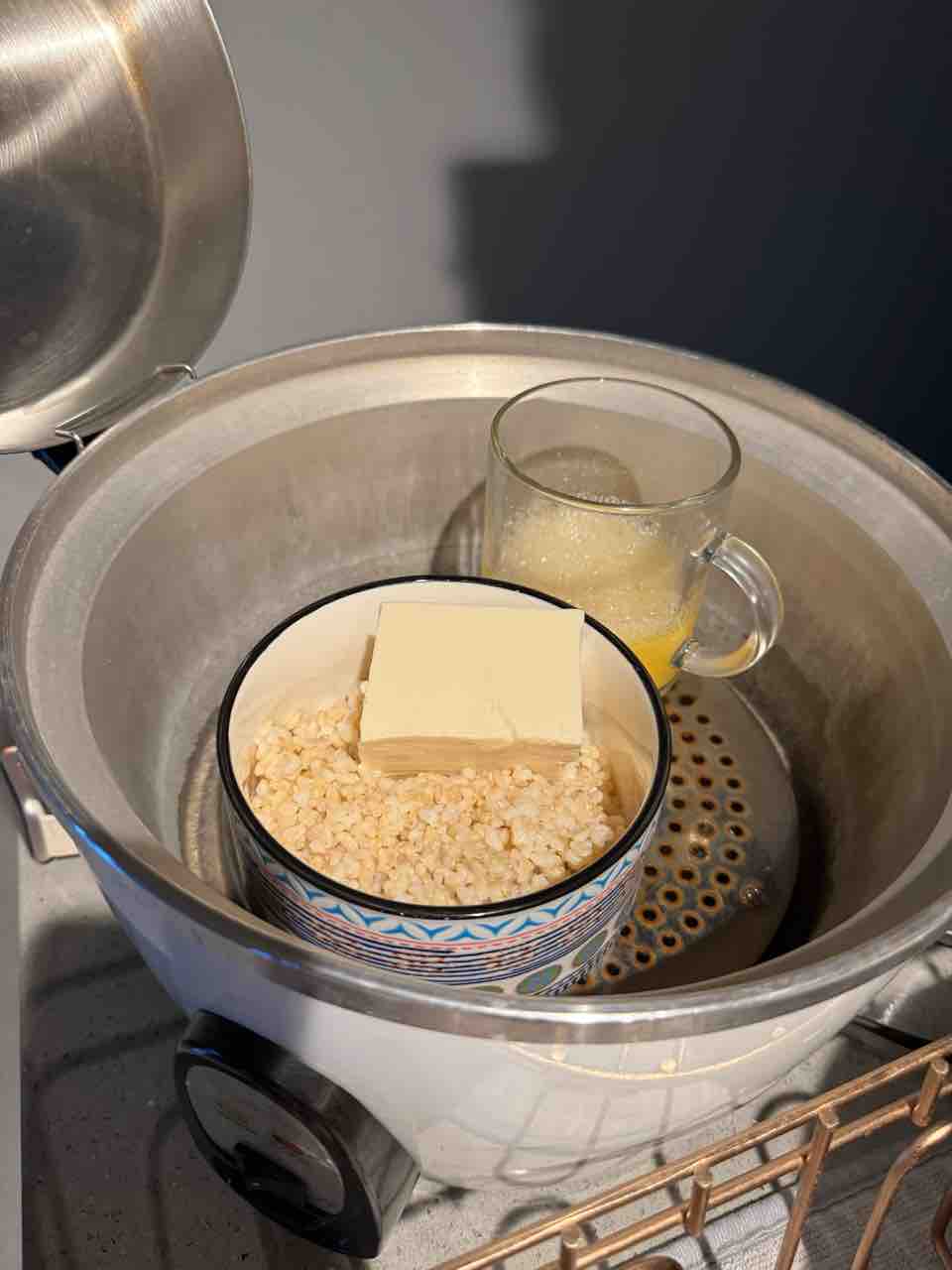 朝は玄米とお豆腐、卵に水と魚醤を入れて溶いたものを大同電鍋で蒸して