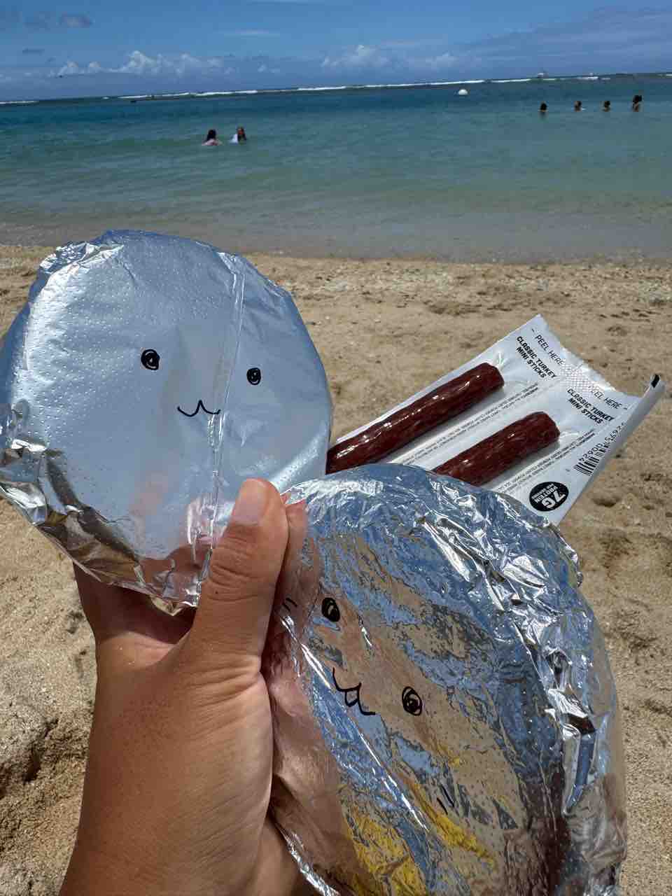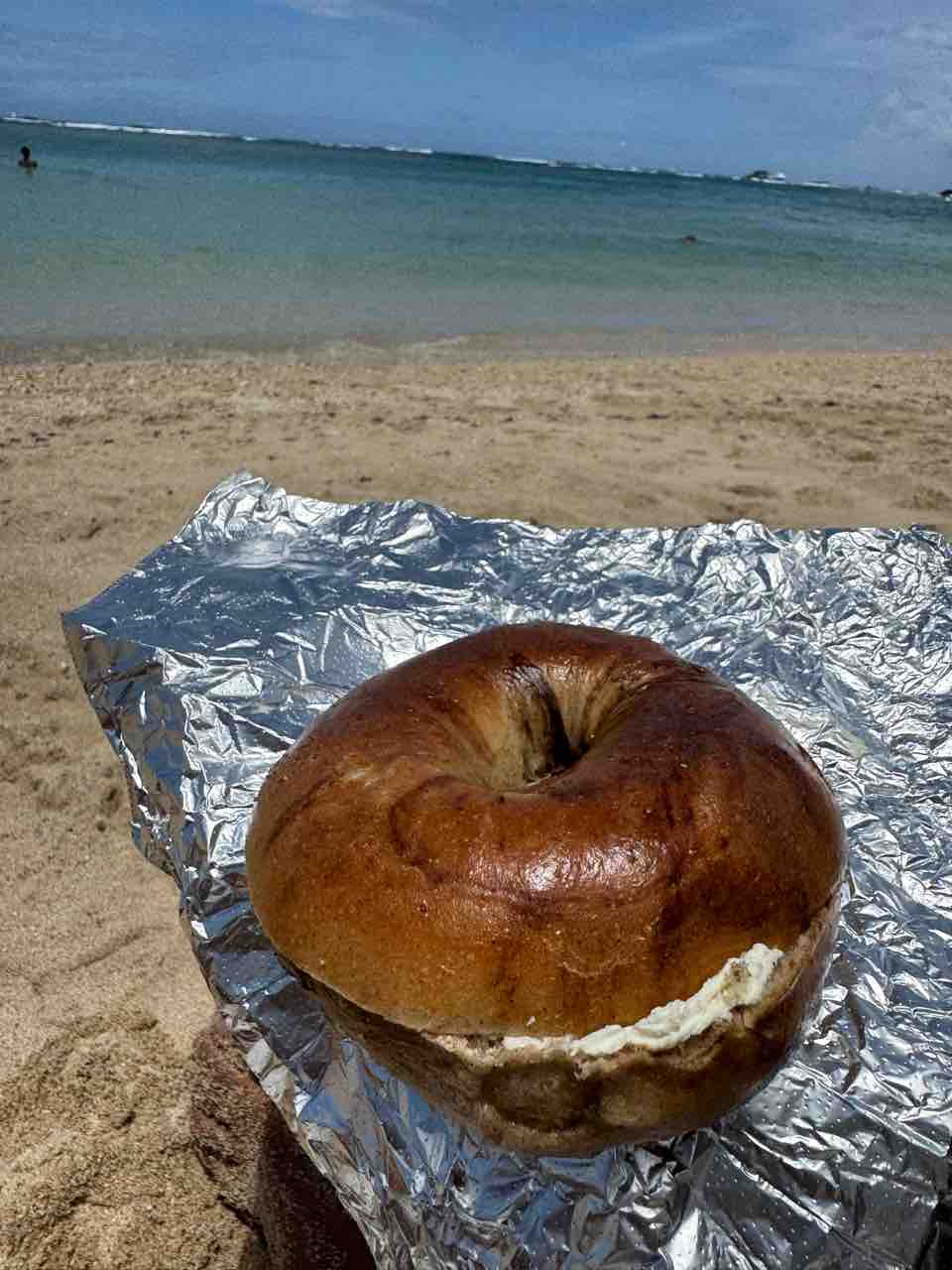 クリームチーズとハワイ島の生蜂蜜を挟んだシナモンレーズンベーグルに、ターキースティックでタンパク質をプラス。