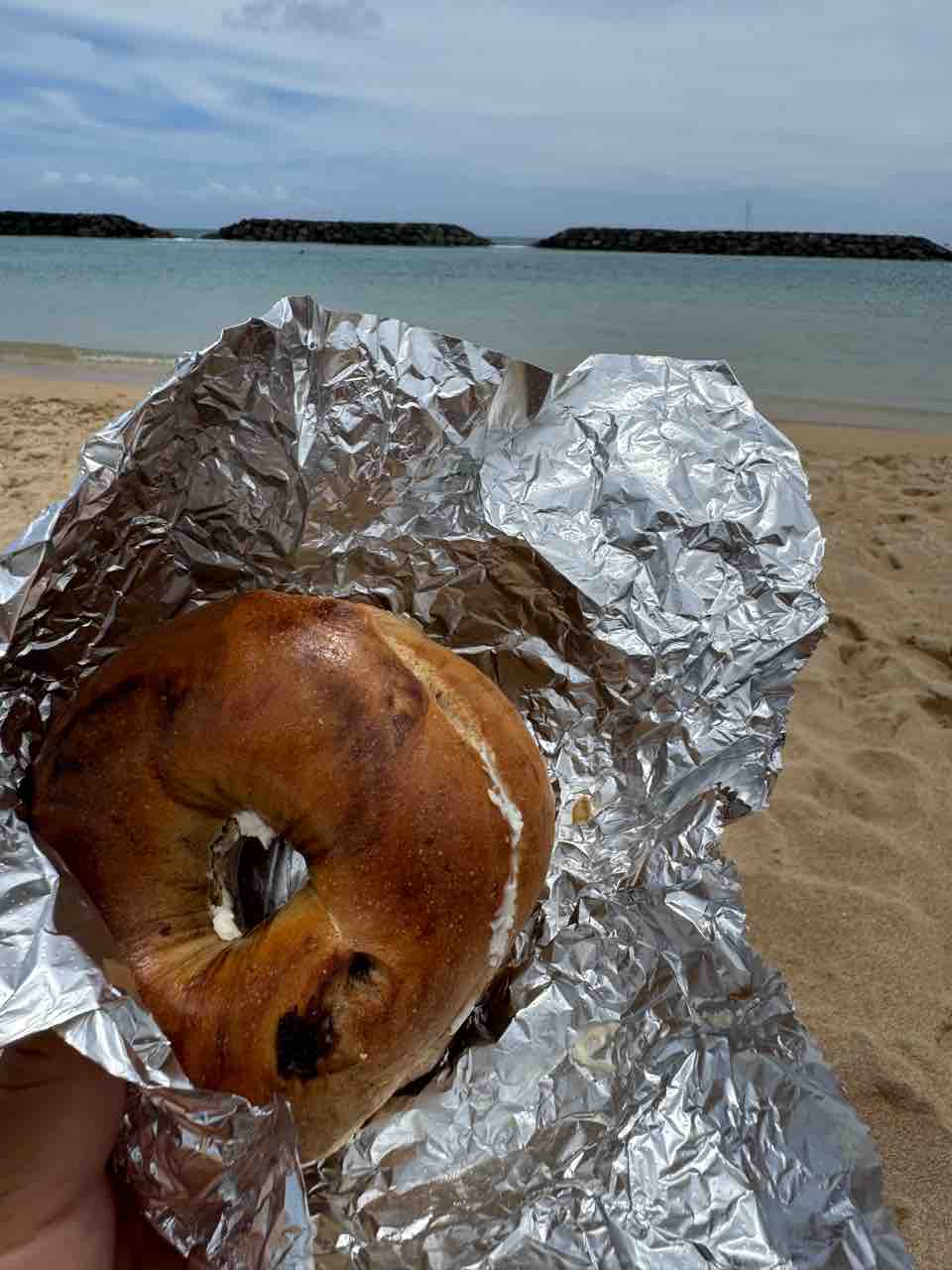 ハワイ島の蜂蜜と、クリームチーズを挟んだだけのシナモンレーズンベーグルです。美味しいよ!