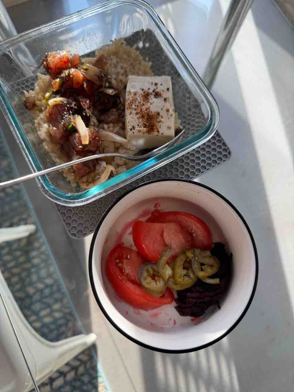 朝は玄米、お豆腐、前日の残りのポケ。