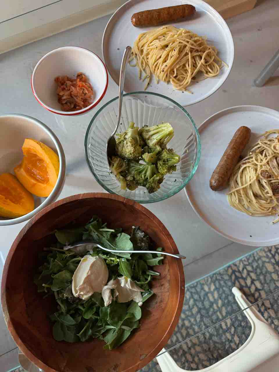 ディナーはサンドライベジタブルを使ったパスタにチキンソーセージ、野菜たち、パパイヤ。