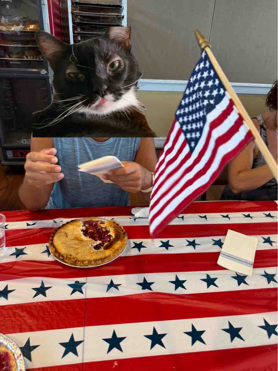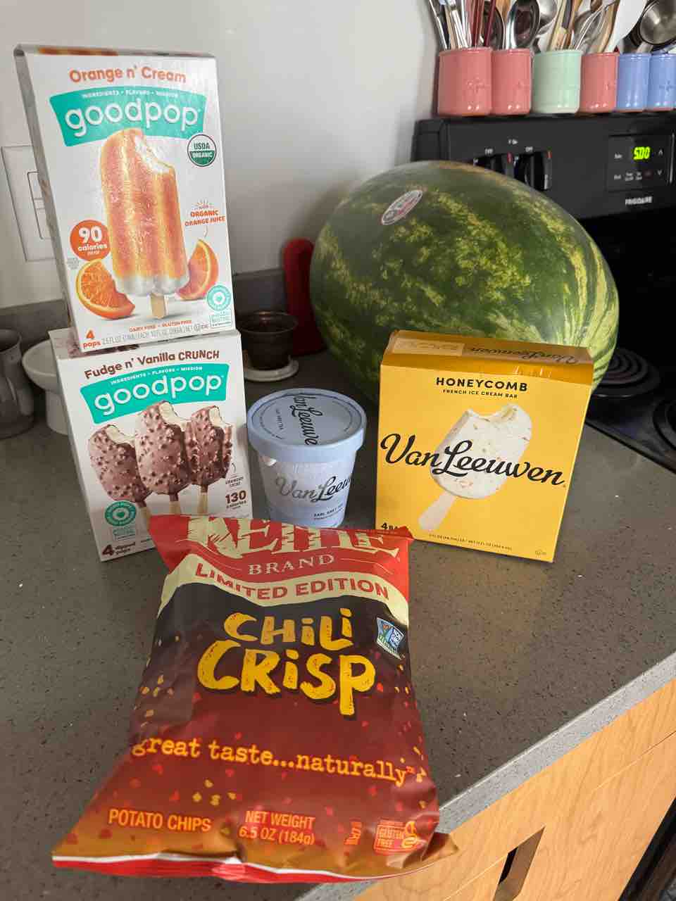 パイ早食いコンテストの後なのに、アイスクリームとポテチを買ってしまう。