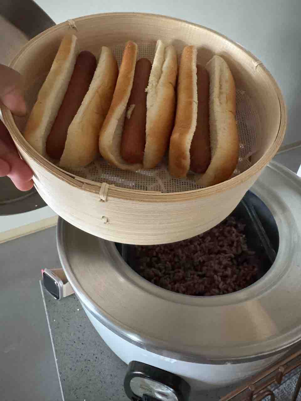 蒸し器の下に雑穀米、上にホットドッグをセット!