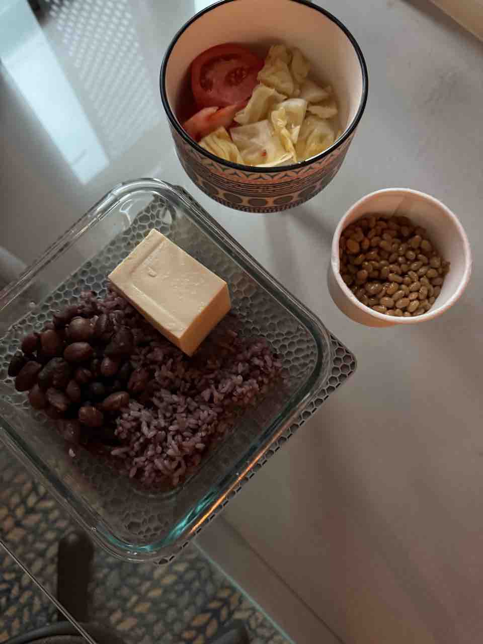雑穀米と豆と豆腐を蒸したやつ、納豆、キャベツとトマト!