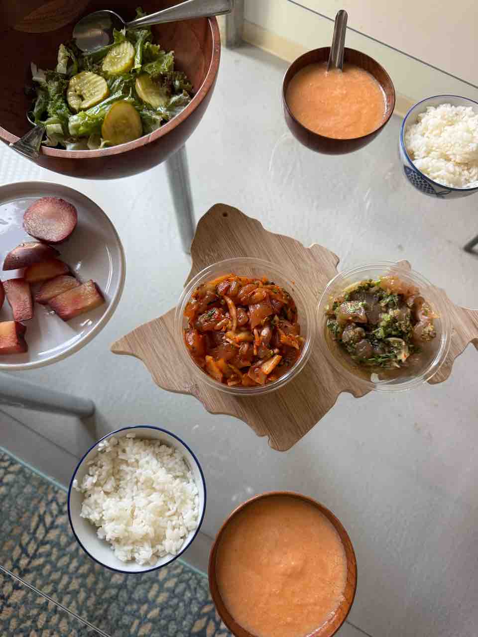 スイカの白いところポタージュ、酢飯、サラダ、プラム。