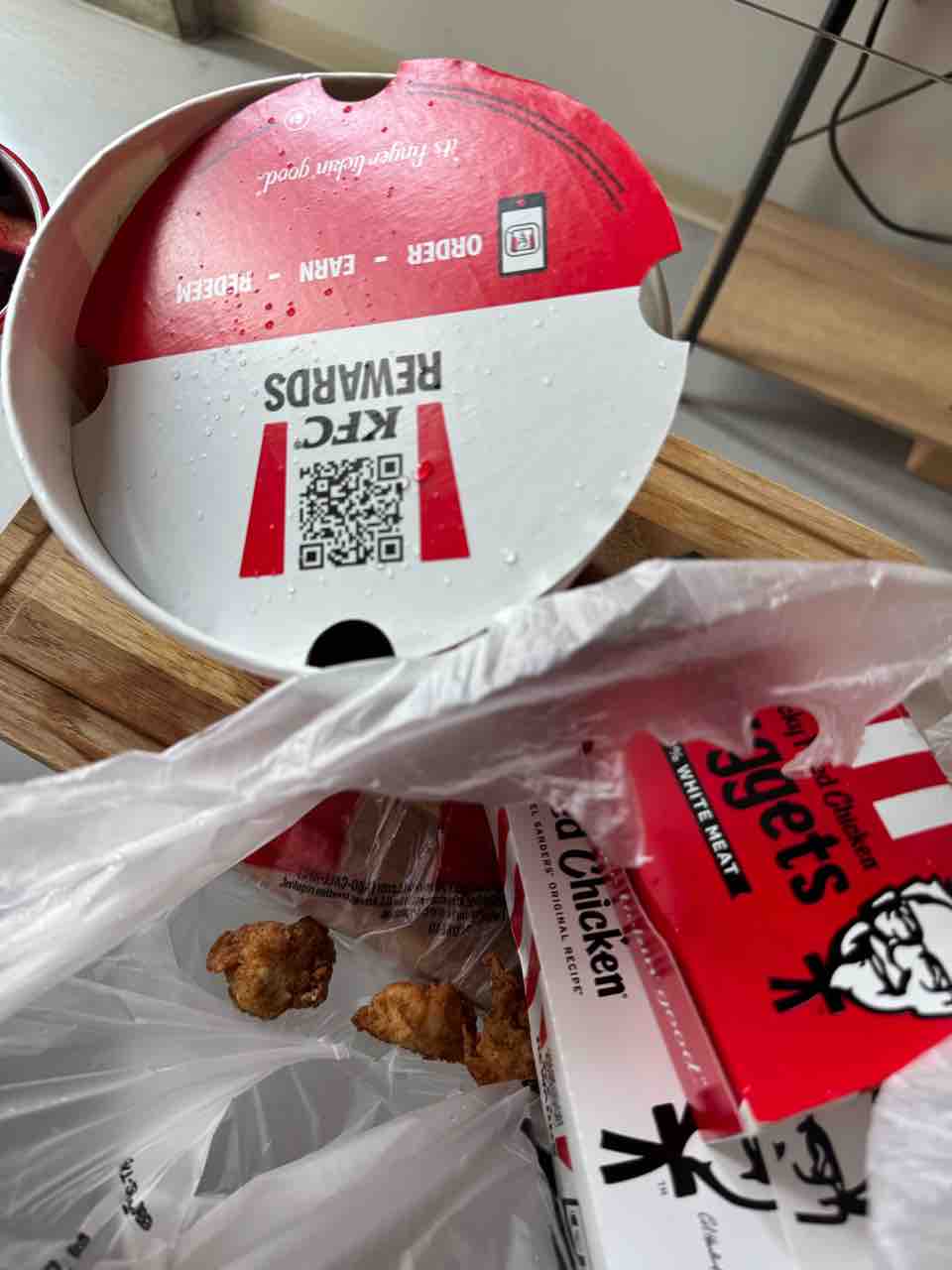 どうやらアプリにあったリワードで、「15ドル以上買うとバケツチキンが無料」っていうのがあって