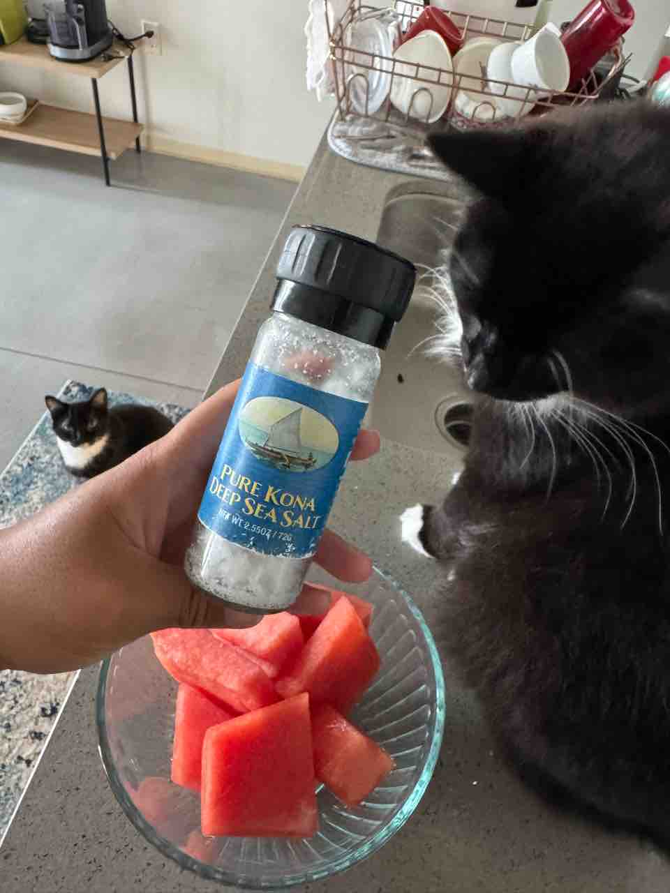 ハワイ島の海洋深層水のお塩をスイカにかけて、ナトリウムとカリウム補給よ😉