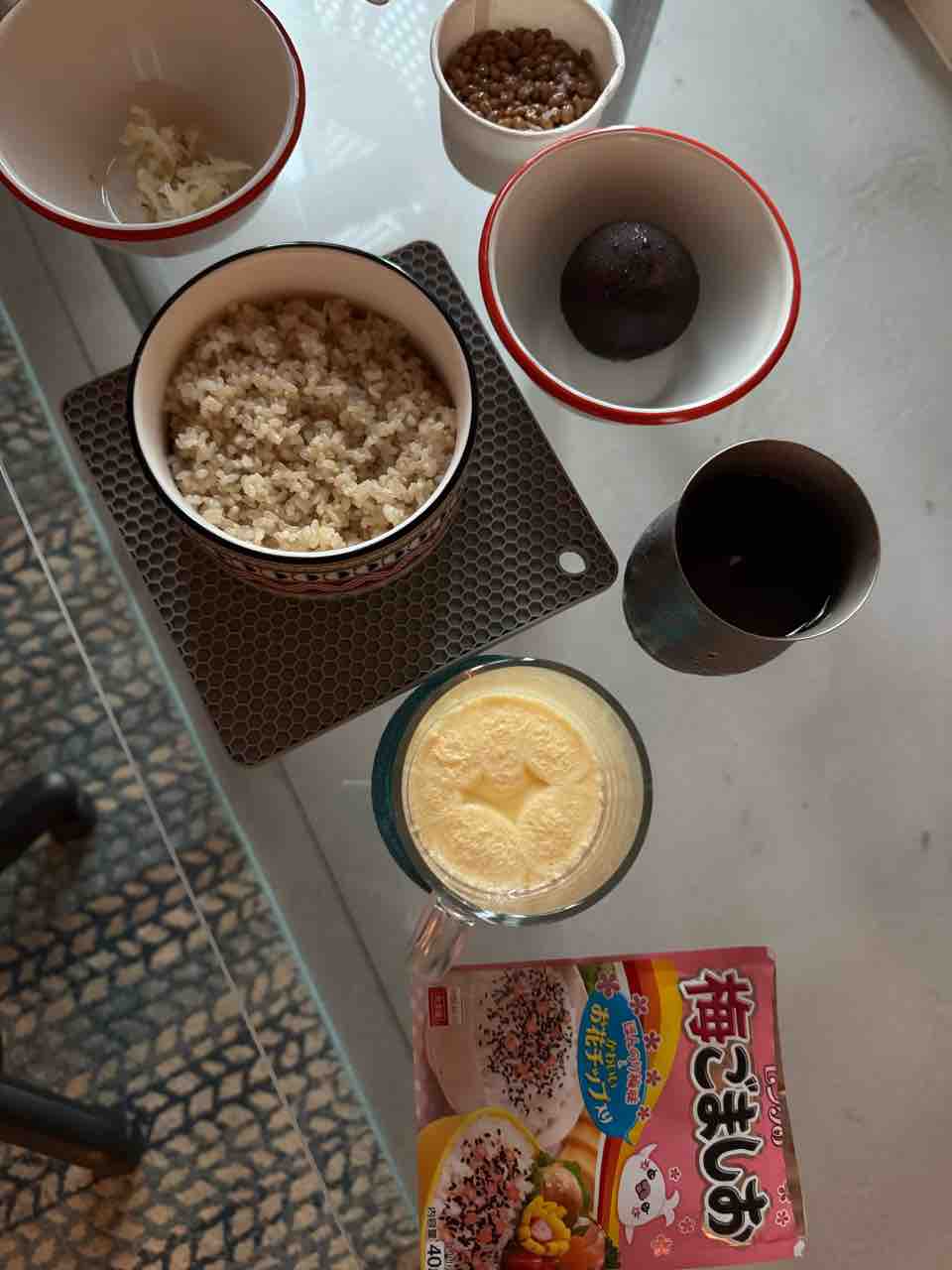 朝は玄米、茶碗蒸しもどき、ザワークラウト、プラム、納豆。