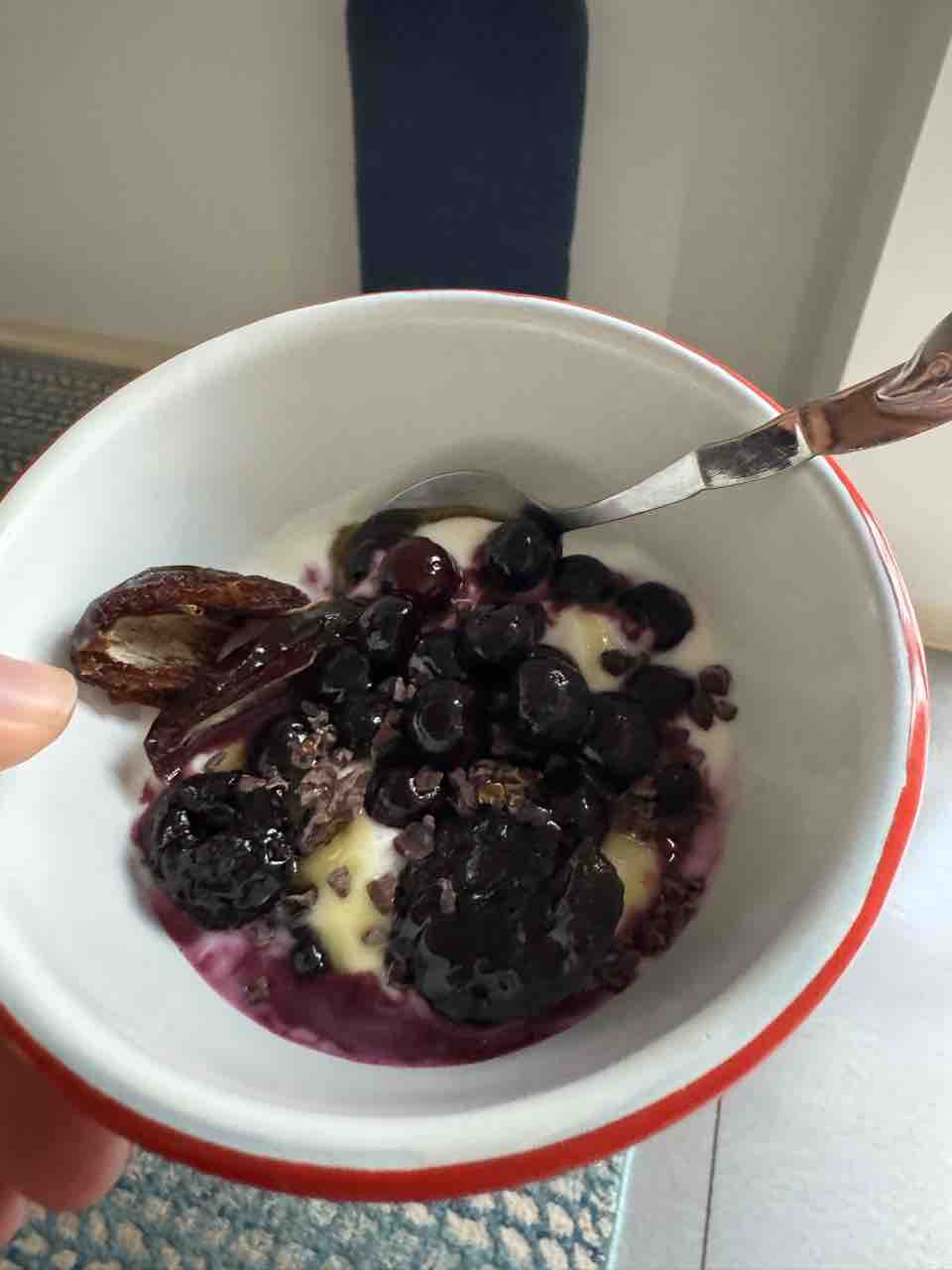 ヨーグルトはオーガニックブルーベリー、デーツ、プルーン、カカオニブ、生蜂蜜が最近のお気に入り。