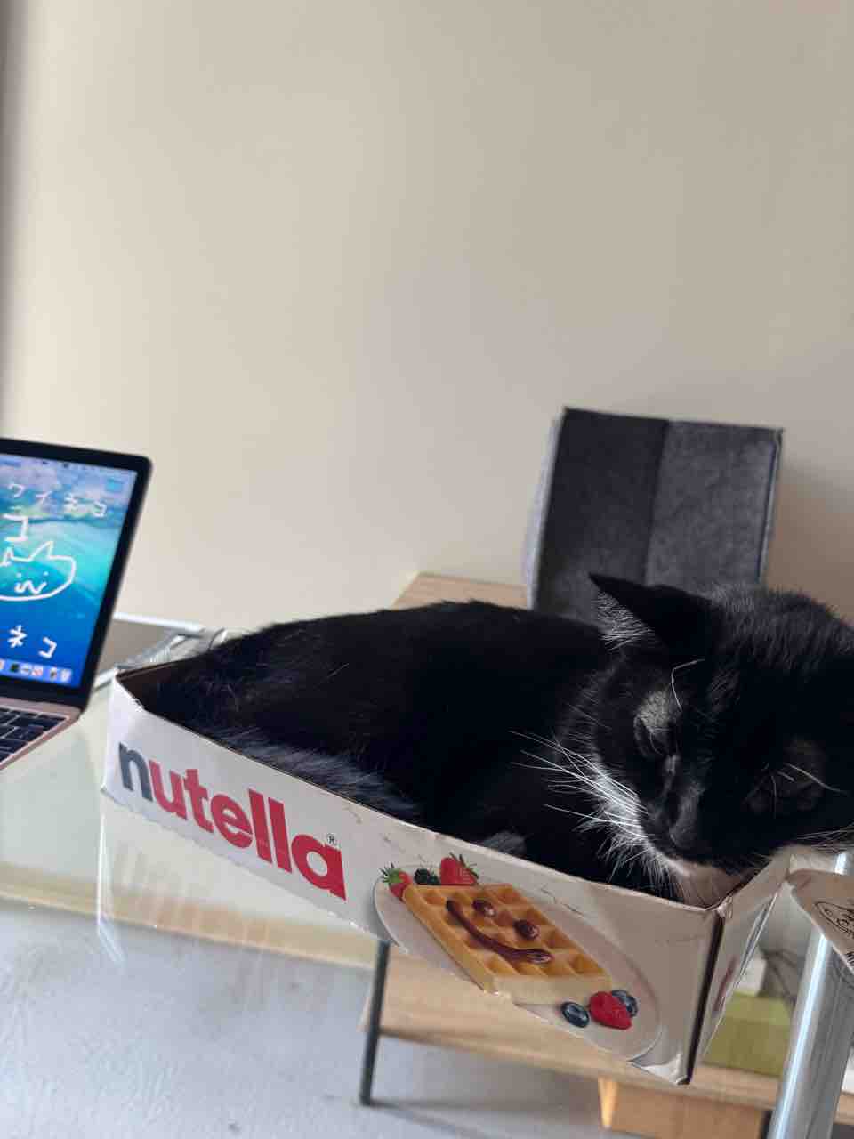 箱に入って寝ていたたま様をパソコンの横に持ってきたので、疲れたら顔を埋められるという最高の環境ですのよ。