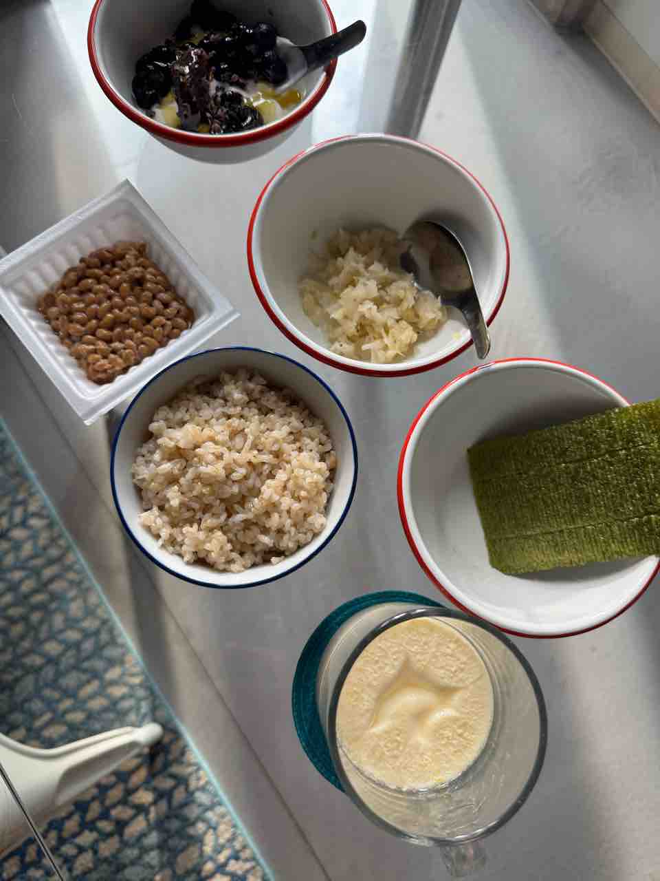 朝は玄米、納豆、茶碗蒸しもどき、海苔、ザワークラウト。