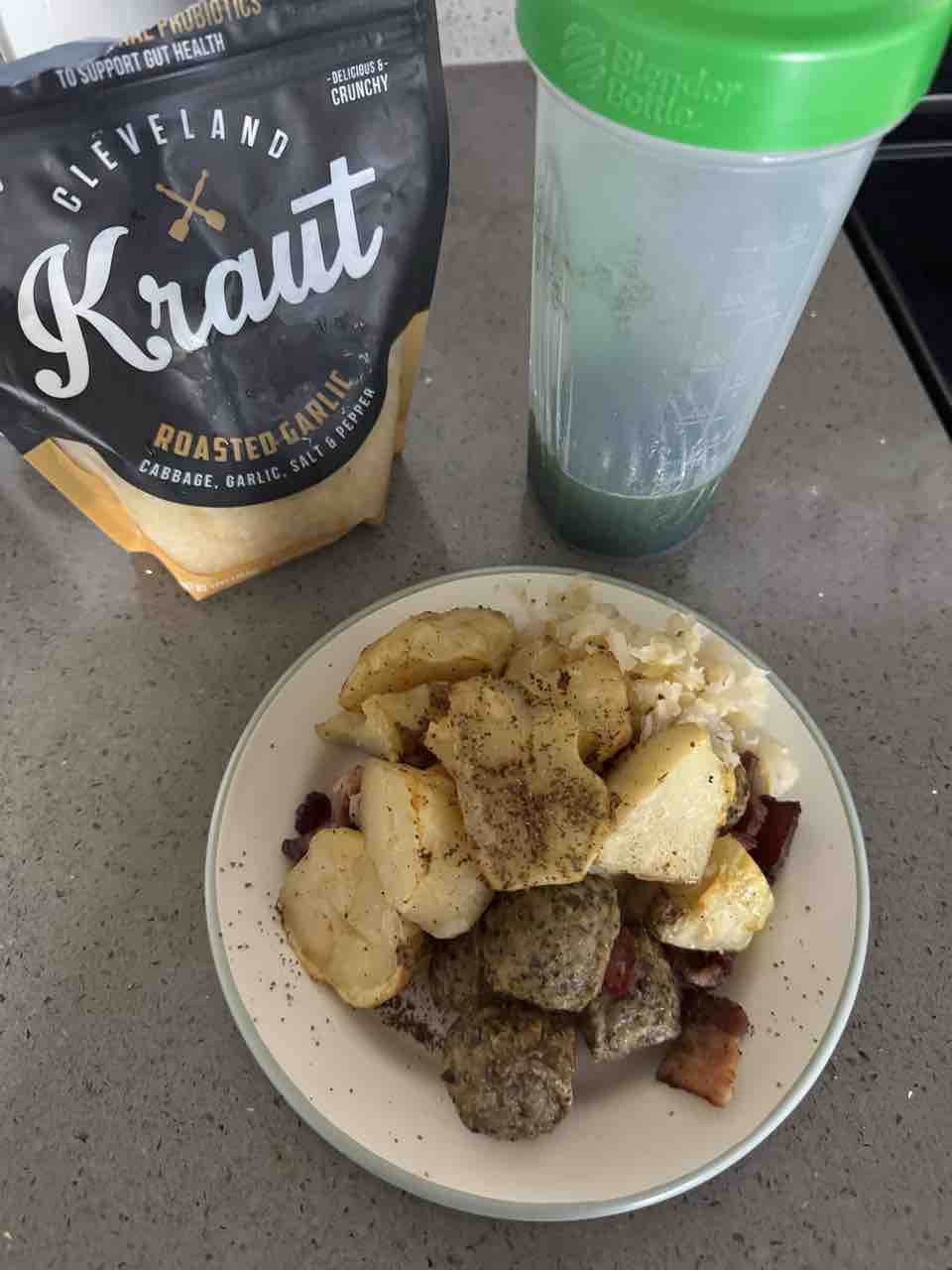 ランチはジャガイモとベーコンとチキンミートボールをエアフライしたやつ。