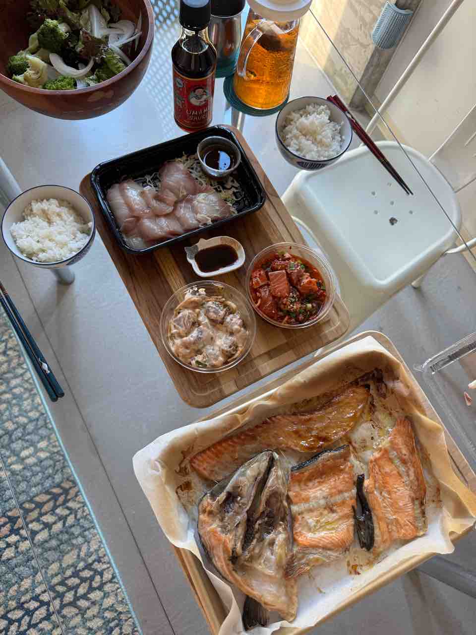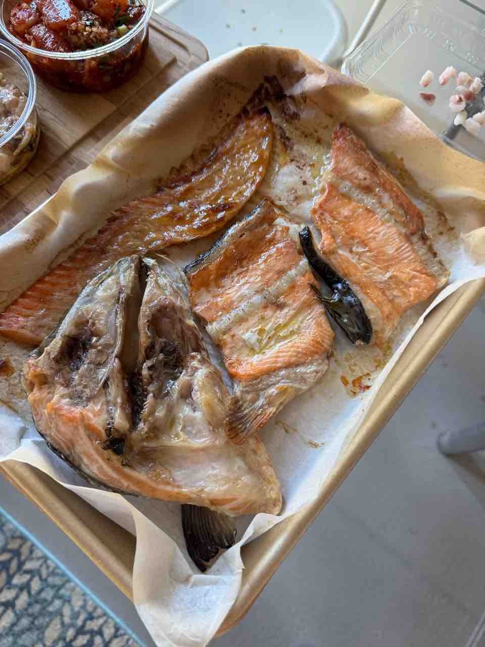 夜ご飯はカハラマーケットで買ったサーモンのアラを焼きまして〜