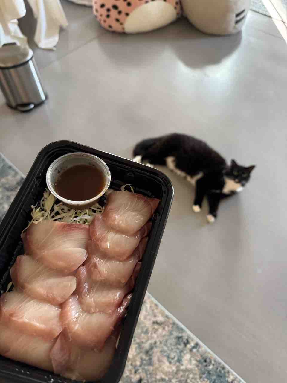 椅子の横でハマチのお刺身待ちをしている、たま様。