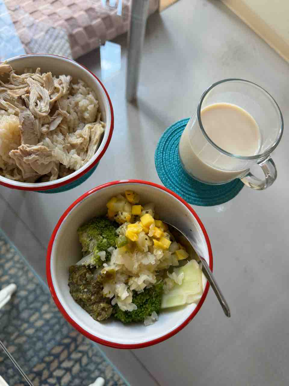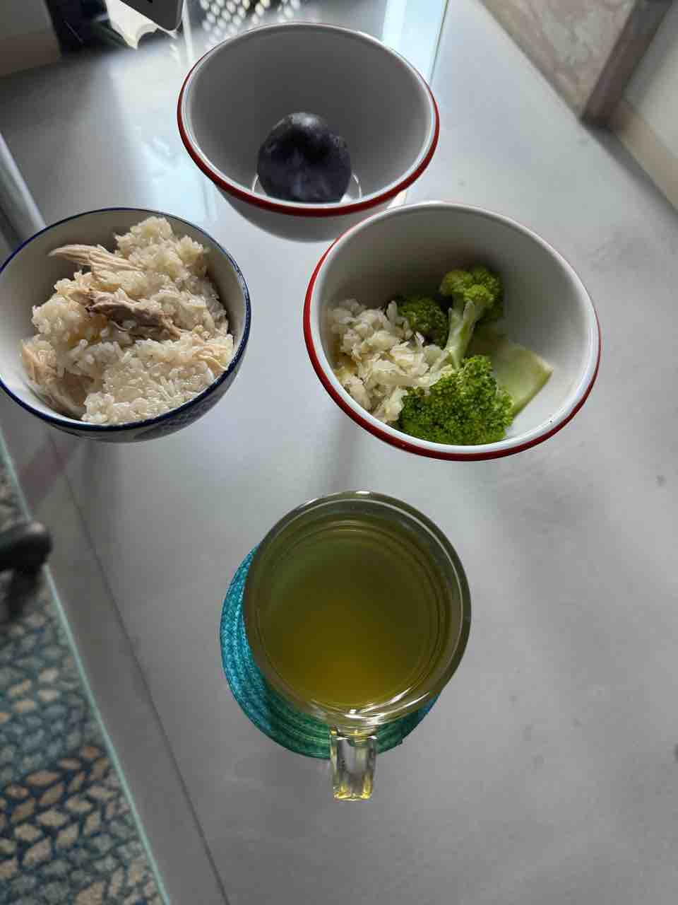 朝はチキンライスとブロッコリー、ザワークラウト、プラムとアプリコットのあいのこ。