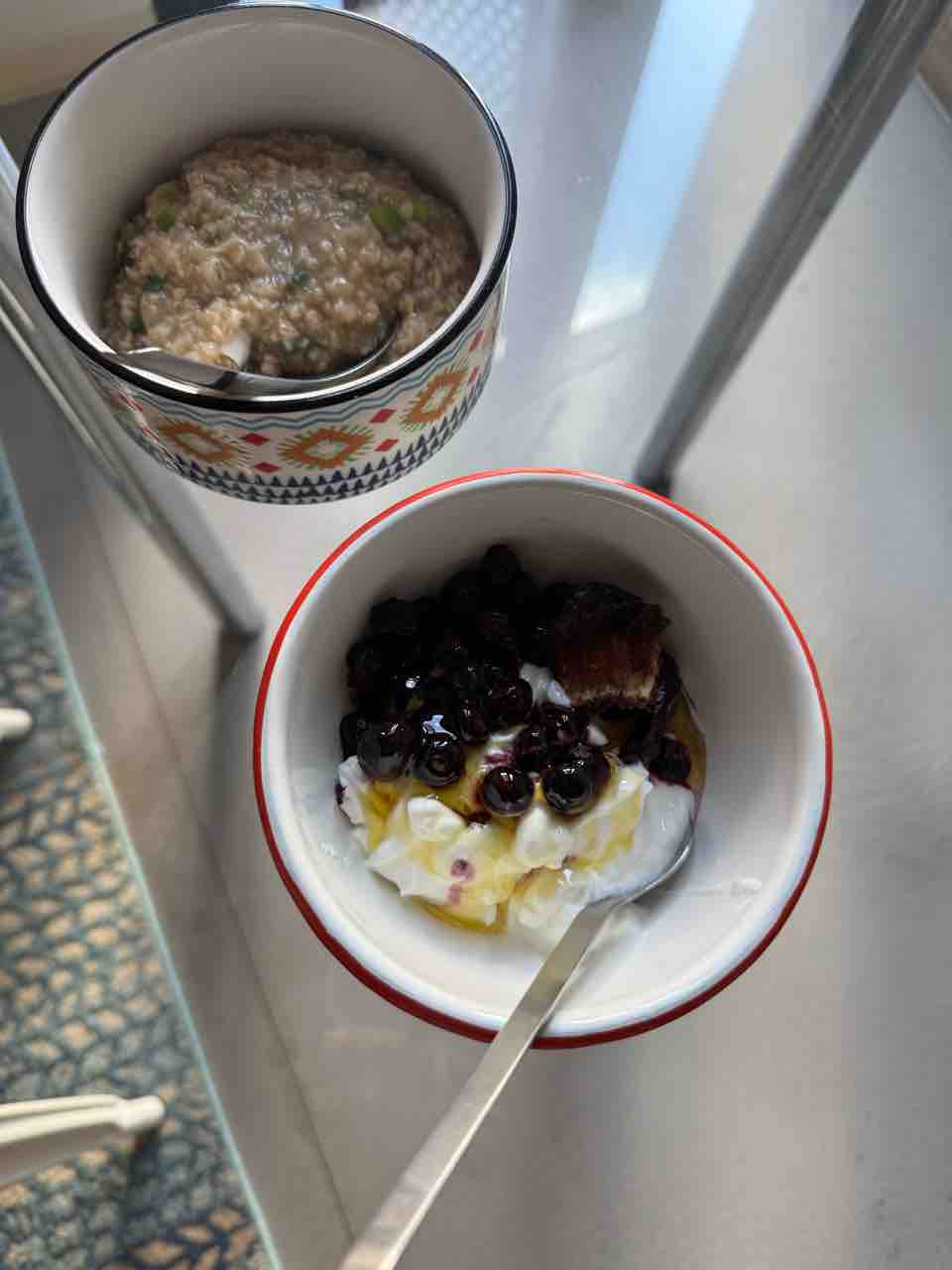 朝はネギ入りオートミール雑炊と、ギリシャヨーグルト。