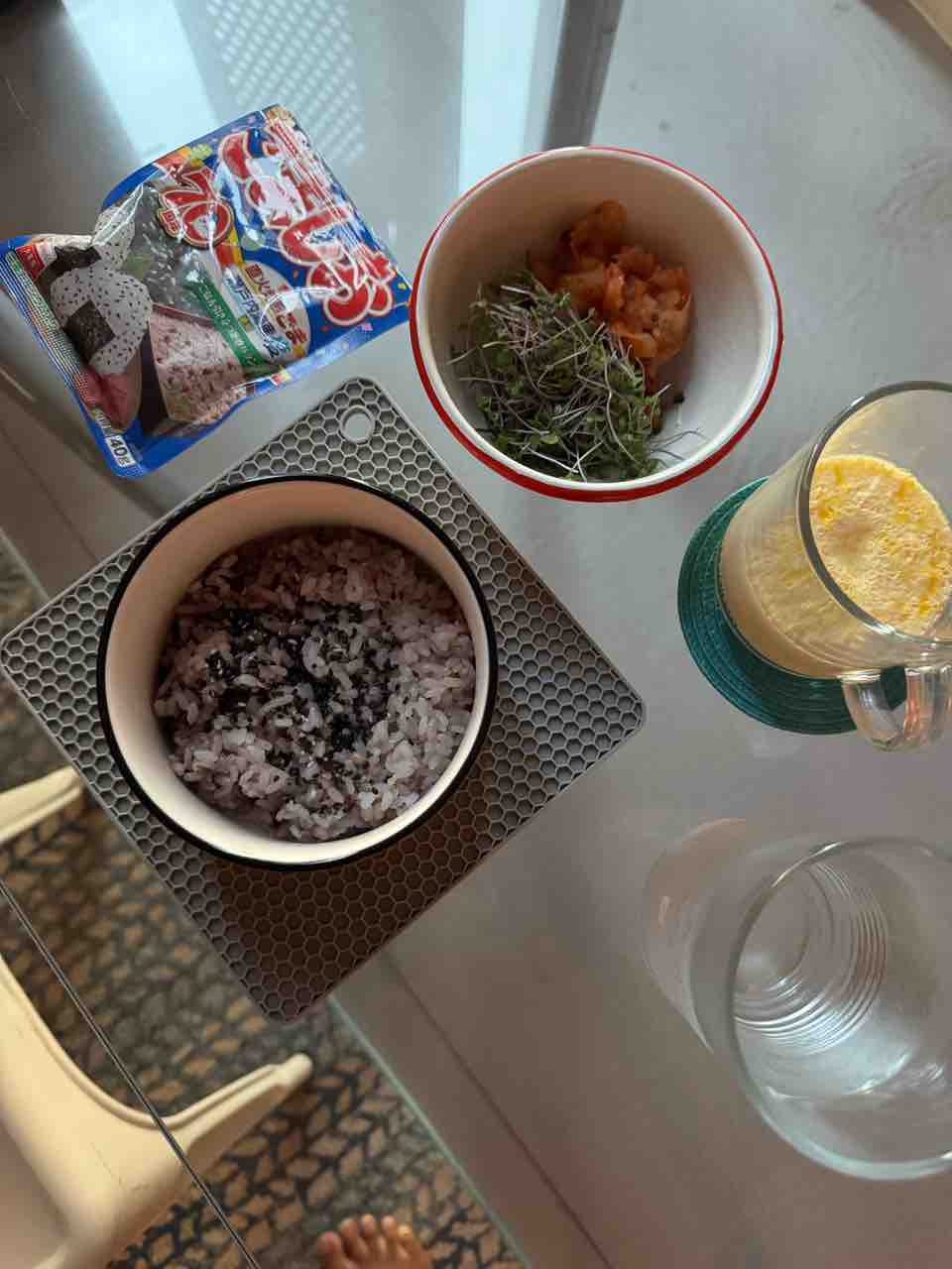 雑穀米に胡麻塩、ブロッコリースプラウトにキムチ、茶碗蒸しもどき。