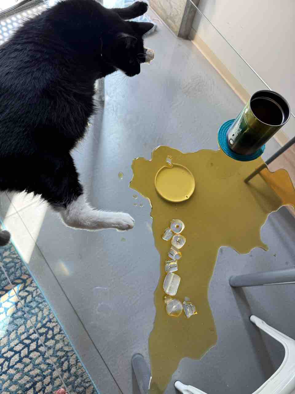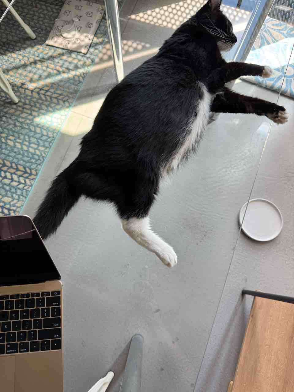 1月に3本足になる前はテーブルの上がお気に入りだったので、乗っけてみたんだけれど、やっぱりテーブルの上は好きらしい。