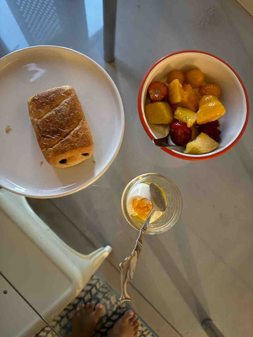 私の朝ごはんはホールフーズのチョコパンとギリシャヨーグルトにフルーツと生蜂蜜。