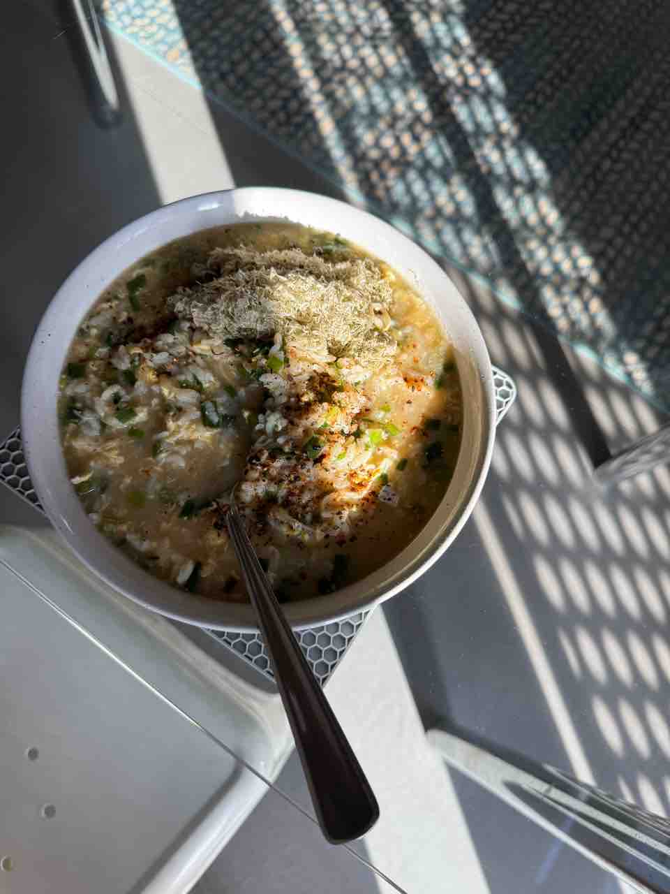朝は卵雑炊っ。ネギたっぷり。とろろ昆布入り。