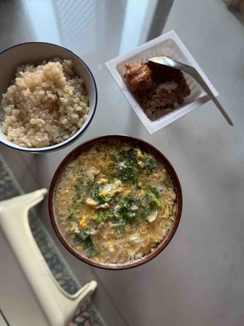 納豆と梅干し。レタスと卵の味噌汁。