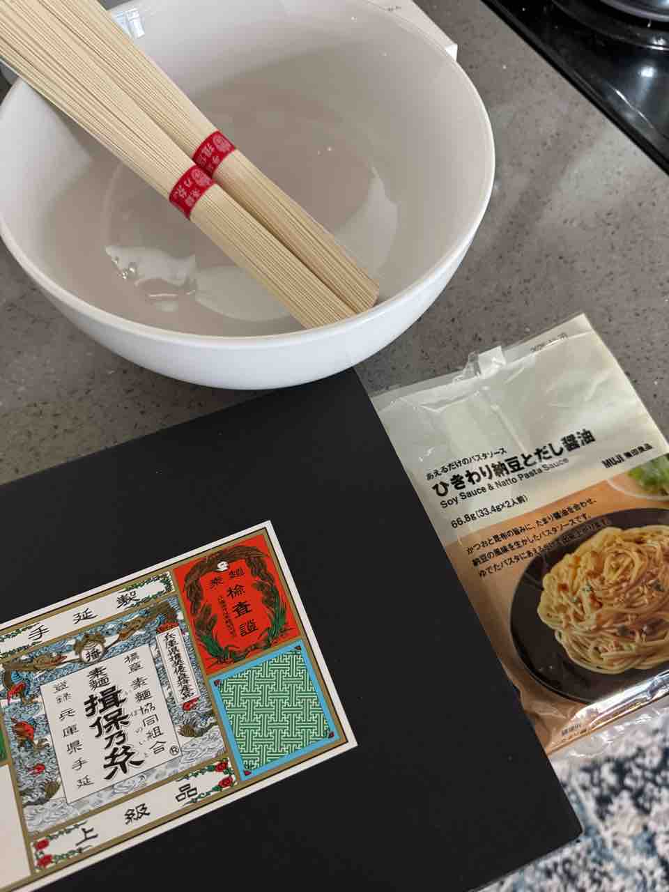 無印で買いすぎた納豆パスタのタレと揖保乃糸。