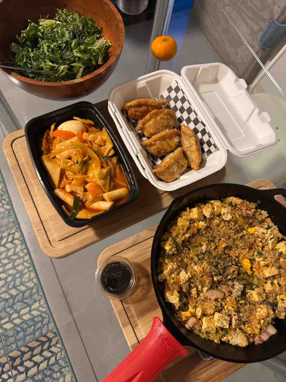 夜ご飯は、e chickenにて調達したトッポッキと揚げ餃子に、サラダとキムチフライドライス。