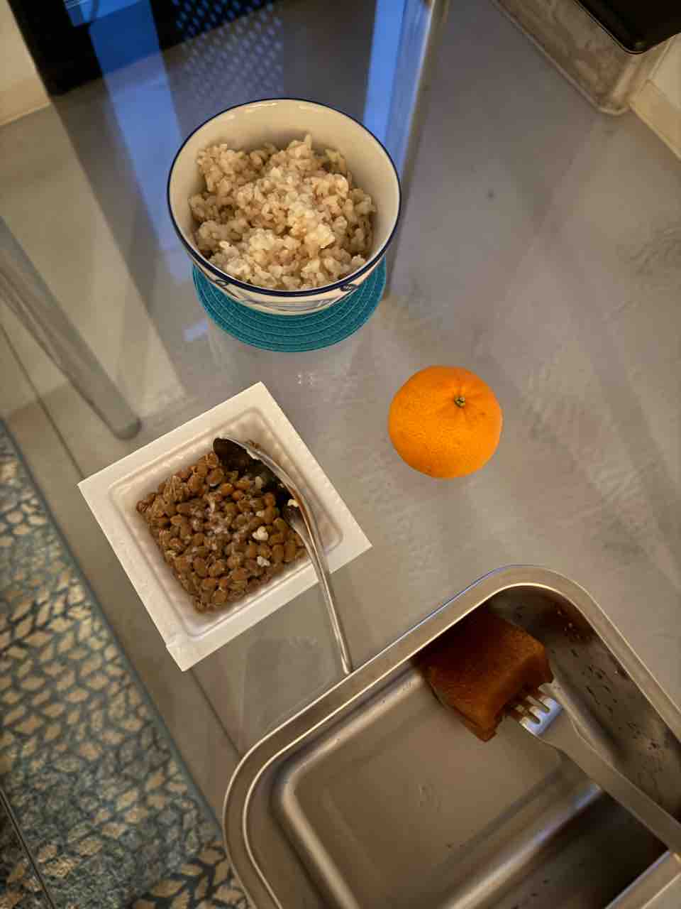 朝は玄米に納豆と、みかん、柿の羊羹食べて