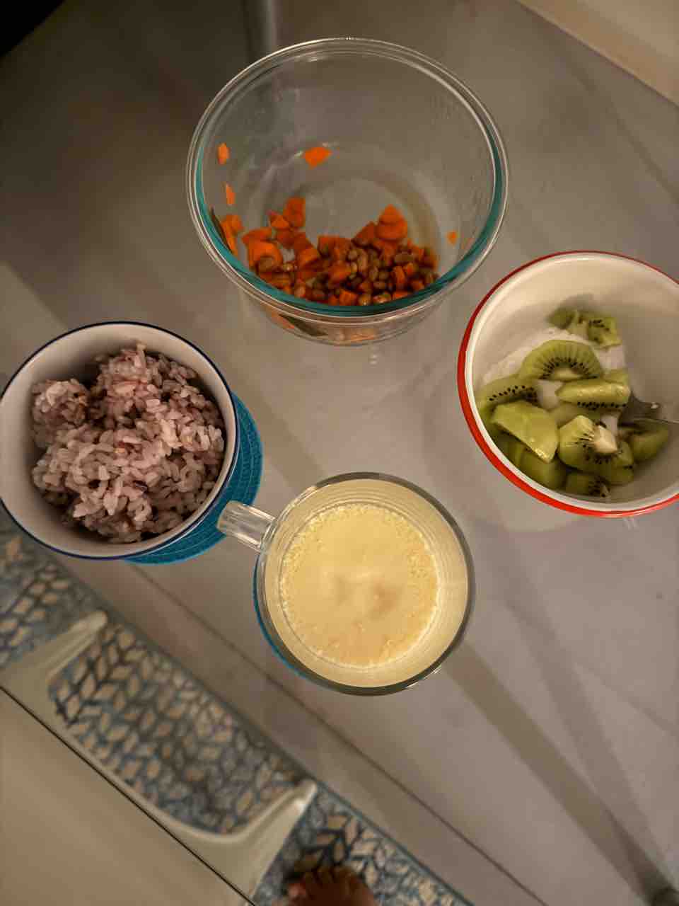 朝ごはんはココナッツヨーグルトにキウイ、納豆糠漬け、茶碗蒸しもどき、雑穀米!