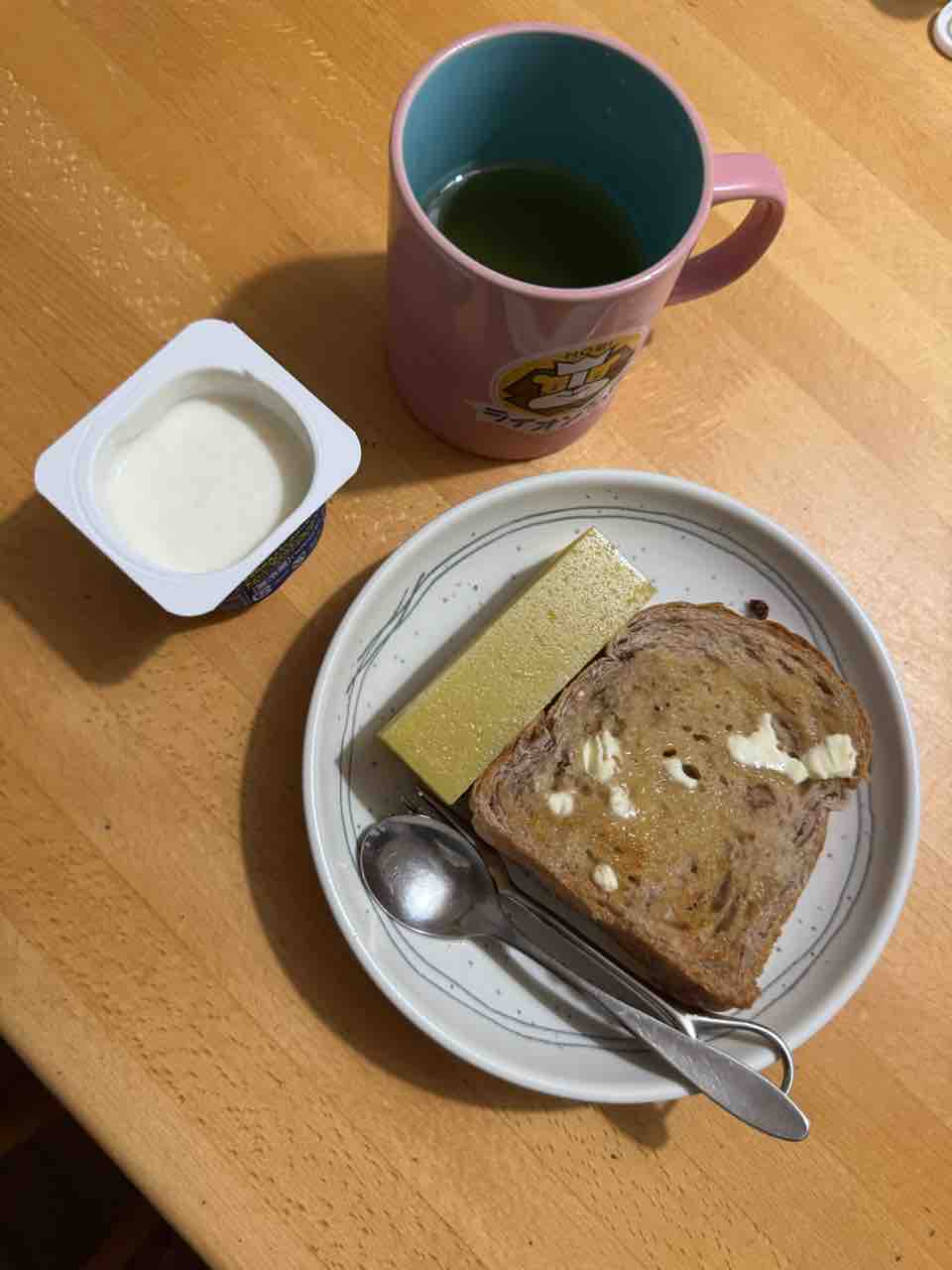 朝ごはんその1として、胡桃とレーズンのパン、舟和の芋羊羹、ヨーグルトをたべて