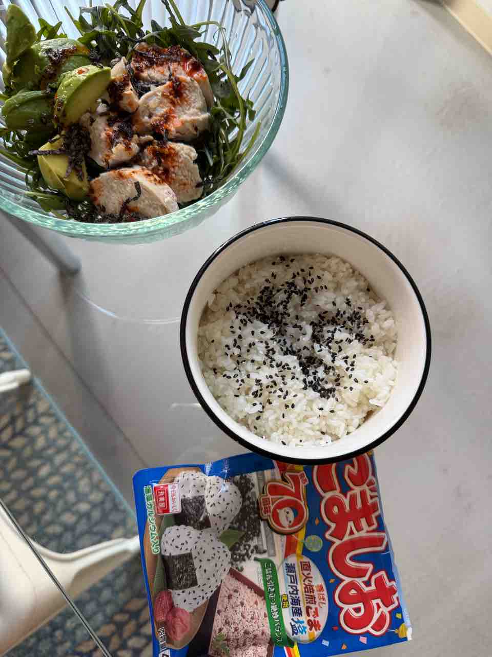 白米と胡麻塩に、アルグラとアボカドと鶏胸肉。